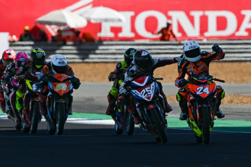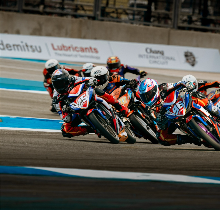 Masuk fase pertengahan lomba, JE konsisten bertahan di barisan depan, terlibat salip-salipan ketat khas UB150 yang mengandalkan slipstream dan late braking di ujung trek lurus Buriram. Ritme balapnya stabil, terlihat nyaman dengan setup motor sehingga bisa tetap nge-push meski tekanan dari rider lain terus datang lap demi lap.